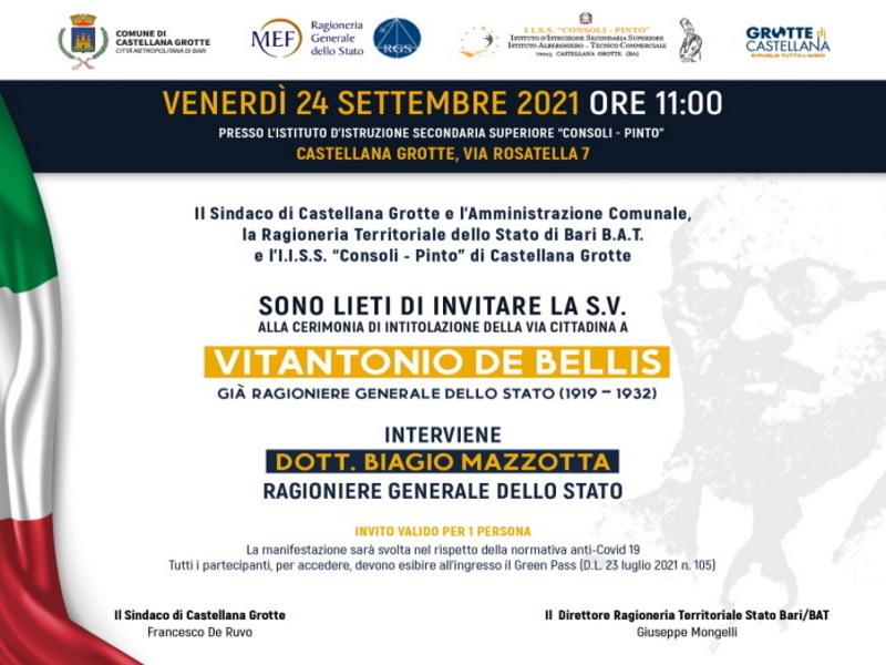 Venerdì 24 settembre 2021, a Castellana Grotte, si svolgerà la cerimonia di intitolazione della via cittadina a Vitantonio De Bellis