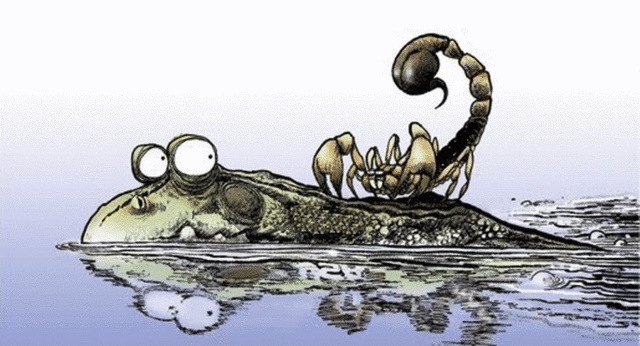 Uno scorpione doveva attraversare un fiume, ma non sapendo nuotare, chiese aiuto ad una rana che si trovava lì accanto. Così, con voce dolce e suadente, le disse: “Per favore, fammi salire sulla tua schiena e portami sull’altra sponda.” La rana gli rispose “Fossi matta! Così appena siamo in acqua mi pungi e mi uccidi!” “E per quale motivo dovrei farlo?” incalzò lo scorpione “Se ti pungessi, tu moriresti ed io, non sapendo nuotare, annegherei!” La rana stette un attimo a pensare, e convintasi della sensatezza dell’obiezione dello scorpione, lo caricò sul dorso e insieme entrarono in acqua. A metà tragitto la rana sentì un dolore intenso provenire dalla schiena, e capì di essere stata punta dallo scorpione. Mentre entrambi stavano per morire la rana chiese all’insano ospite il perché del folle gesto. “Perché sono uno scorpione…” rispose lui “È la mia natura!”